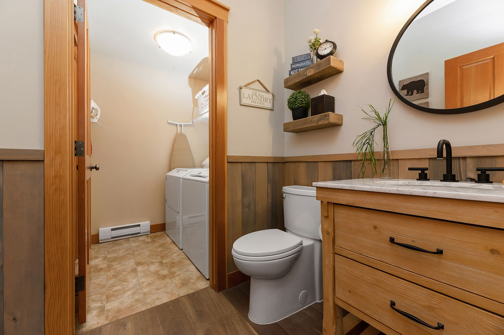 Master ensuite, second full bathroom and a 1/2 bathroom on main floor. In-unit laundry room with full size washer and dryer.
