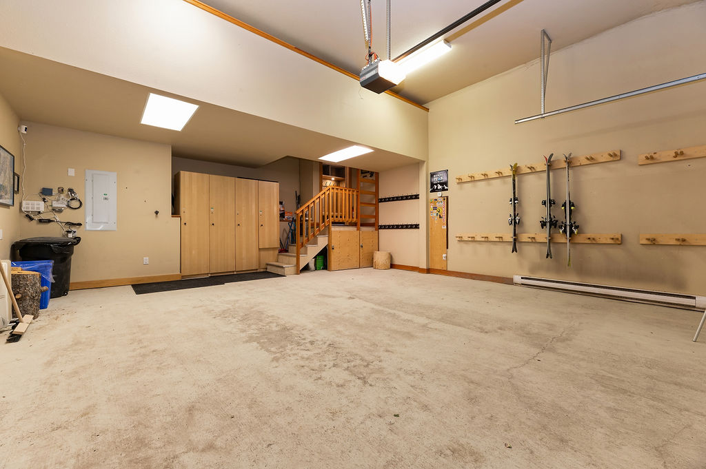 Heated garage complete with ski racks for storage.