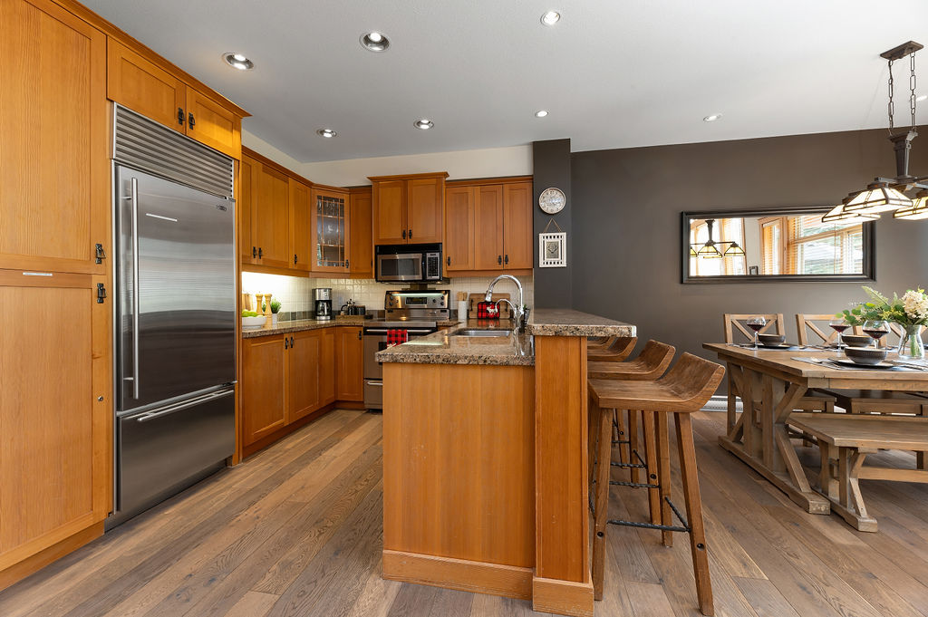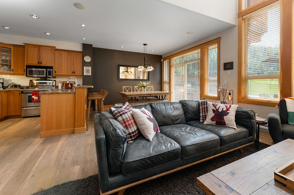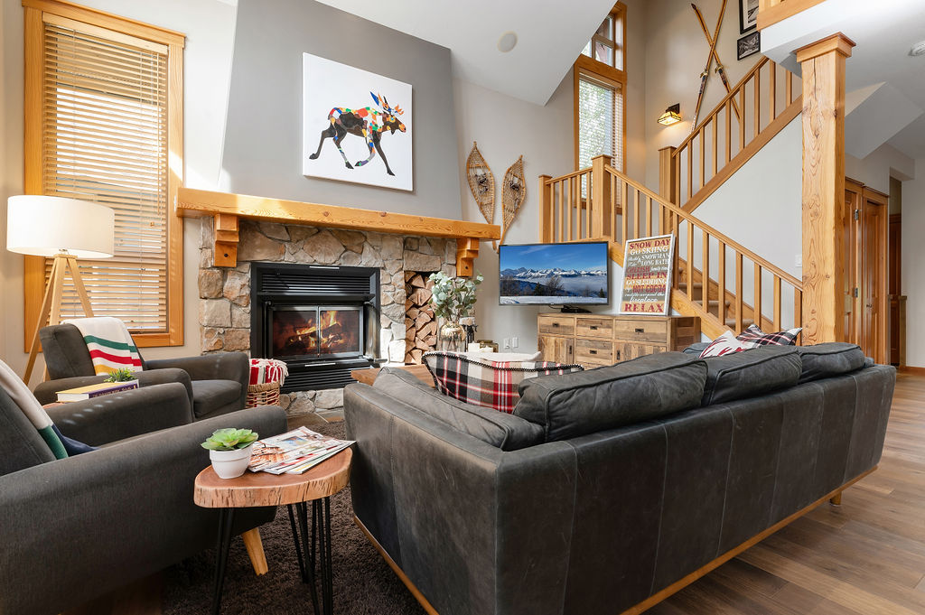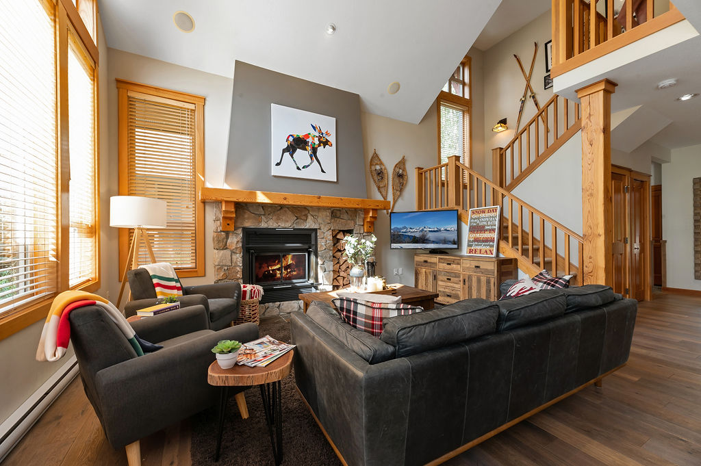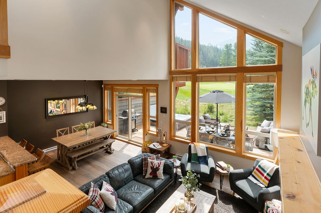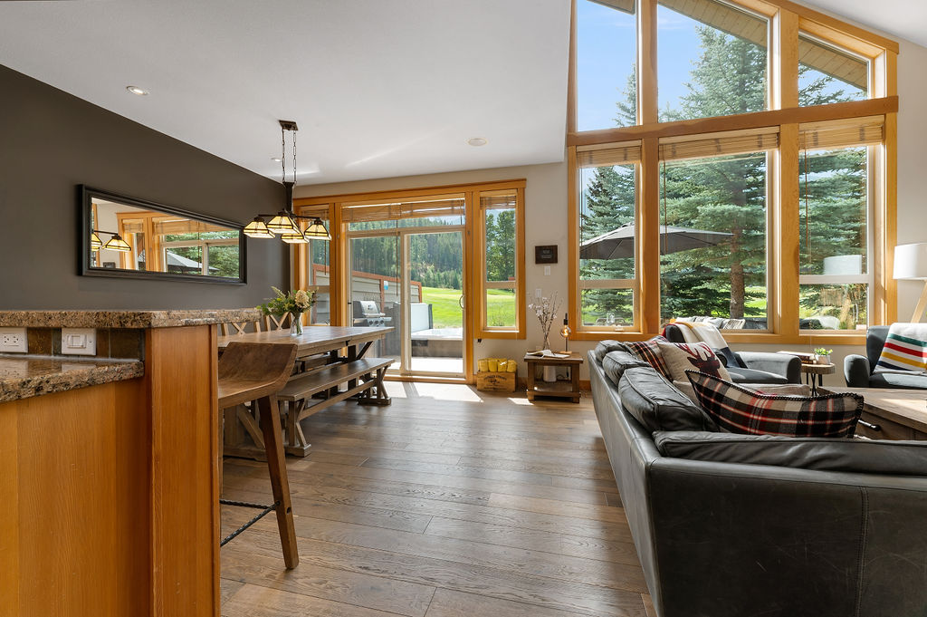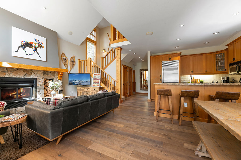 The heart of the chalet is a spacious, open-concept living area with sweeping views of the golf course and mountains. Gather around the wood-burning fireplace, put on a Netflix movie on the 50" Smart TV, and let the evening unfold. A SONOS Wi-Fi sound system wired throughout the entire home — including the hot tub deck — means the music never stops. Challenge the family to a board game, crack open a book, or simply sink into the couch and enjoy the view. However you choose to unwind, it's all here.