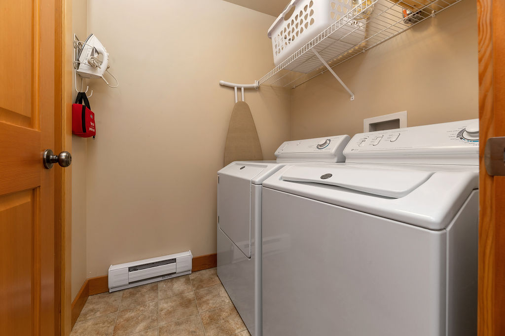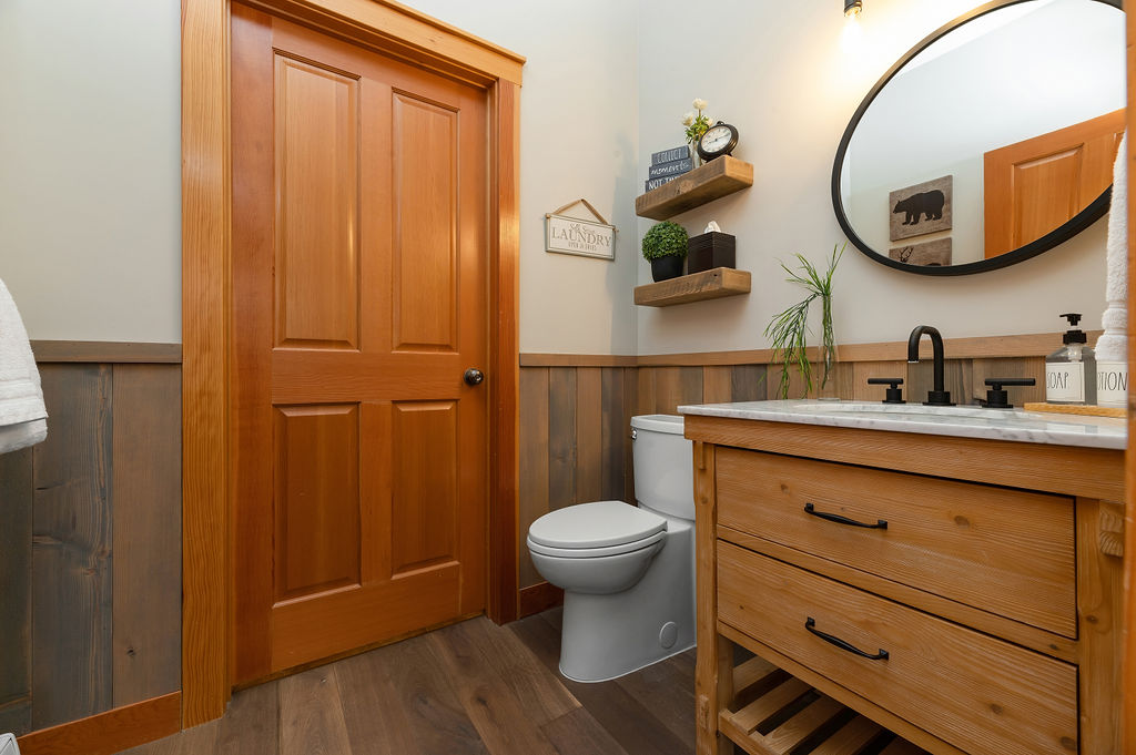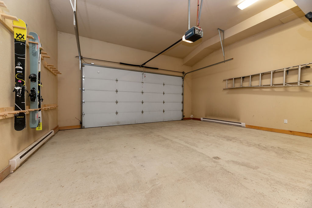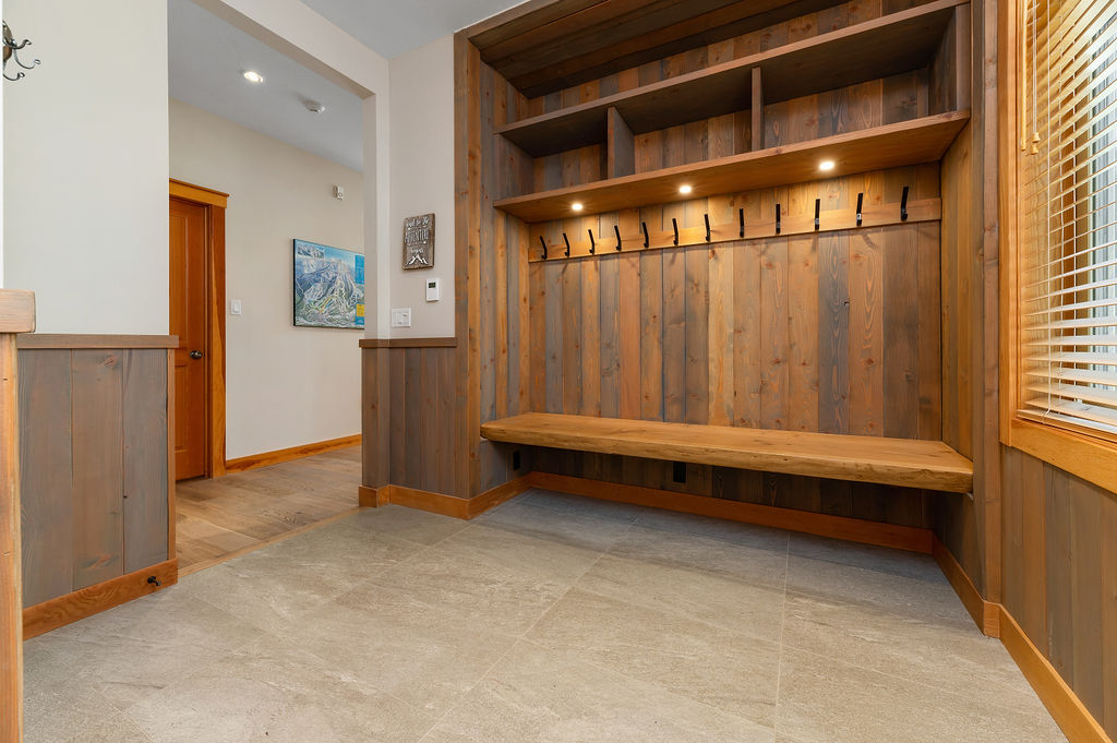A well-designed mudroom sets the mountain vibe, ensuring a clean transition from outdoors to indoors — with a built-in bench, hooks, and open shelving to keep outerwear organized and ready to go. The main floor chalet also includes a half-bathroom, a dedicated laundry room to tackle post-adventure cleanups, and an oversized two-car heated garage with plenty of room for ski gear, golf clubs, and bikes.