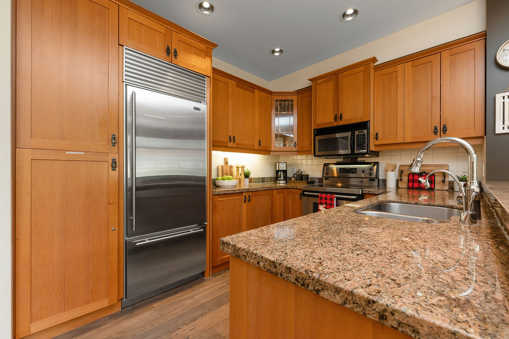 The primary bedroom is a true retreat — vaulted ceilings, a private balcony with unobstructed views of Greywolf Golf Course, a 5-piece ensuite, and a 40" Smart TV for those nights when you just want to sneak up and watch a movie.