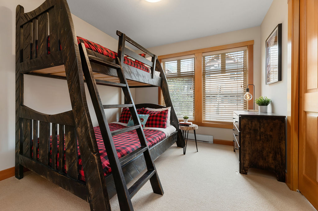 Two bedrooms separated by solid wood pocket doors — a king bed on one side and a single-over-double bunk on the other. A perfect setup for families, with the flexibility to open the space up or close it off as needed.