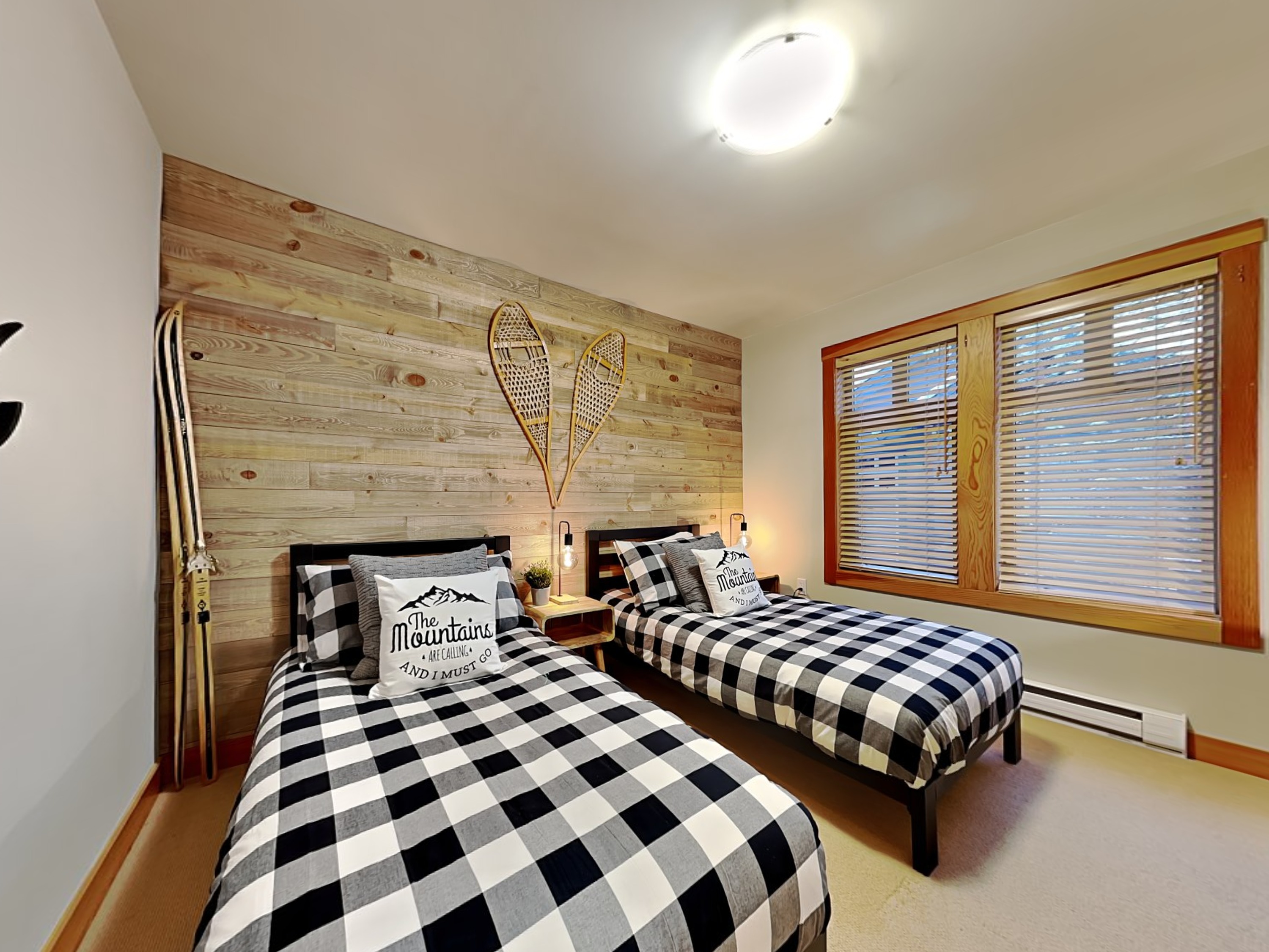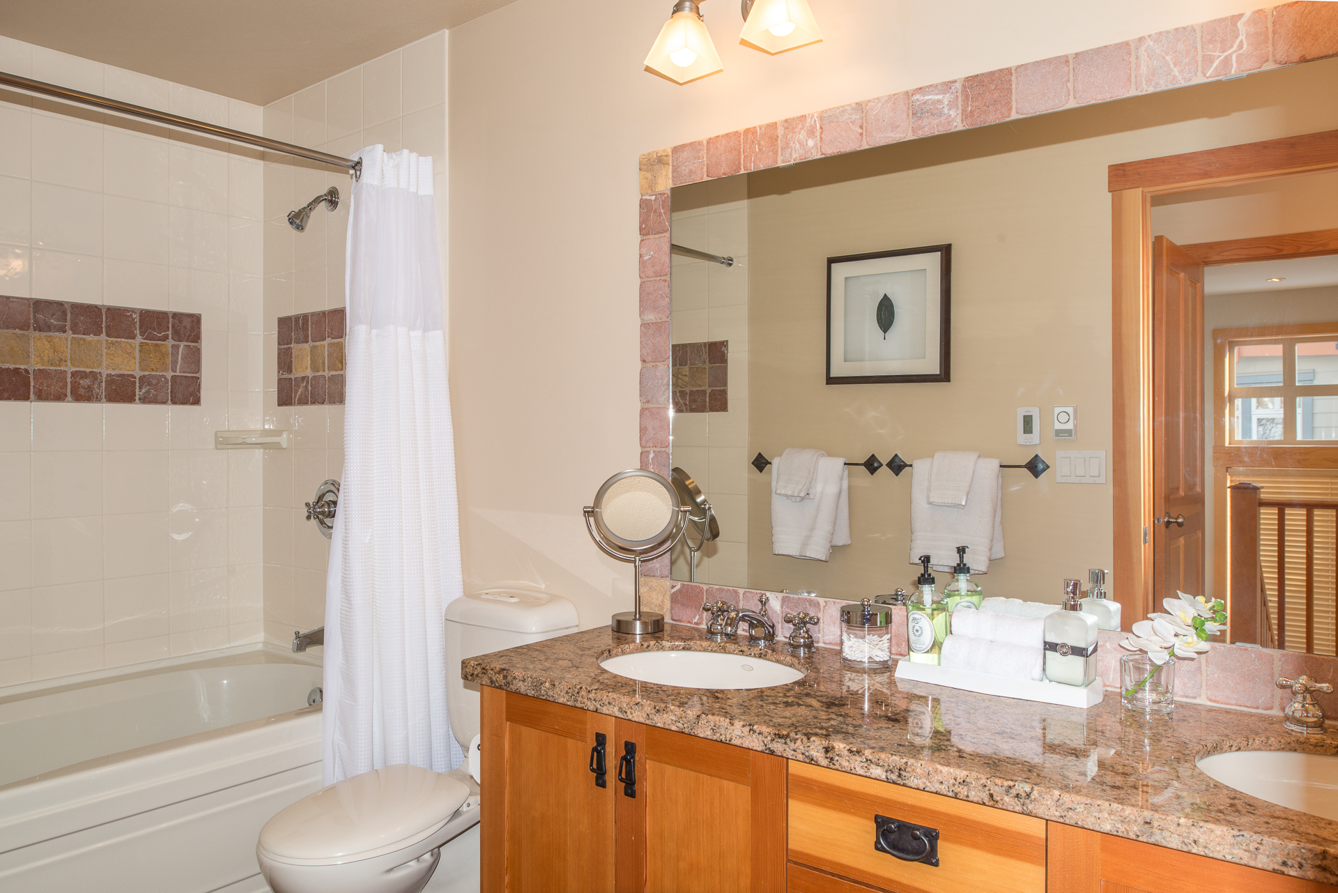 The primary ensuite features double sinks, a combined tub and shower, and heated floors for that extra touch of warmth after a day on the mountain.